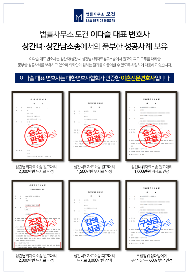 위 사건의 경우 의뢰인은 자신이 기혼자이며 불륜 사실을 알고 있어 현실적으로 금액을 줄이기 어려웠지만 변호사의 전문적인 도움으로 가장 적은 금액으로 변호할 수 있었습니다. 따라서 법무법인 에이앤랩은 현실적으로 어려워 보이는 사건에서도 성공할 수 있습니다. 특히 간통 소송에서 피고인을 대리하고 전략적으로 대응했으며 소송을 성공적으로 기각했으며 위자료를 줄였습니다. 서울중앙지검 검사부터 태평양 지역 메이저 로펌까지 전문성이 검증된 대표들이 면접부터 재판까지 모든 절차를 책임진다. 따라서 금전적 부담을 줄이고 하루빨리 문제를 해결하고 싶다면 에이앤랩의 변호사와의 면담을 이어가시기 바랍니다. (24시간 법률상담 가능) 02-538-0340 *저녁/주말에도 전화연결로 직접 안내 가능합니다. 법무법인 카카오톡.pf.kakao.com과 채팅 (더 많은 성공 사례) 법무법인 에이앤랩상사그룹 법무법인 에이앤랩 이혼상사그룹 변호사, 이혼법무법인, 상법률사무소 서울/인천/수원/대구 총 5번 출구 회사의 Jiangnan 역의.문의하기 02-538-0340trustnlab.co.kr 이전 이미지 다음 이미지
